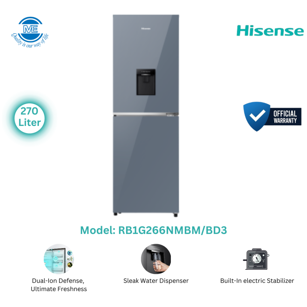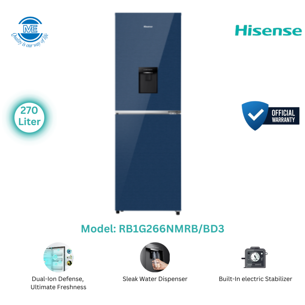 HISENSE 270 Liter BMF Glass Door Inverter Refrigerator With Water Dispenser Royal Blue | RB1G266NMRB/BD3