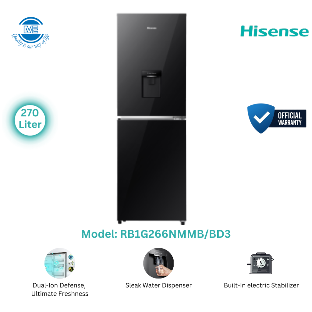 HISENSE 270 Liter BMF Glass Door Inverter Refrigerator Mirror Black With Water Dispenser | RB1G266NMMB/BD3