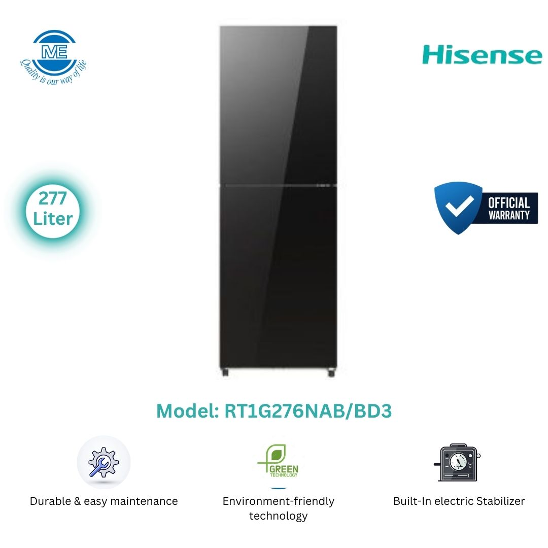 Transform your home with the Hisense 277 L Top Mount Freezer (RT1G276NAB/BD3) in striking black glass. Featuring a total capacity of 277 L (158 L fridge + 119 L freezer), this inverter-powered refrigerator delivers efficient, quiet cooling. It includes LED lighting, a built-in stabilizer and condenser, an ice maker, adjustable glass shelves, and durable ABS lining—perfect for modern households