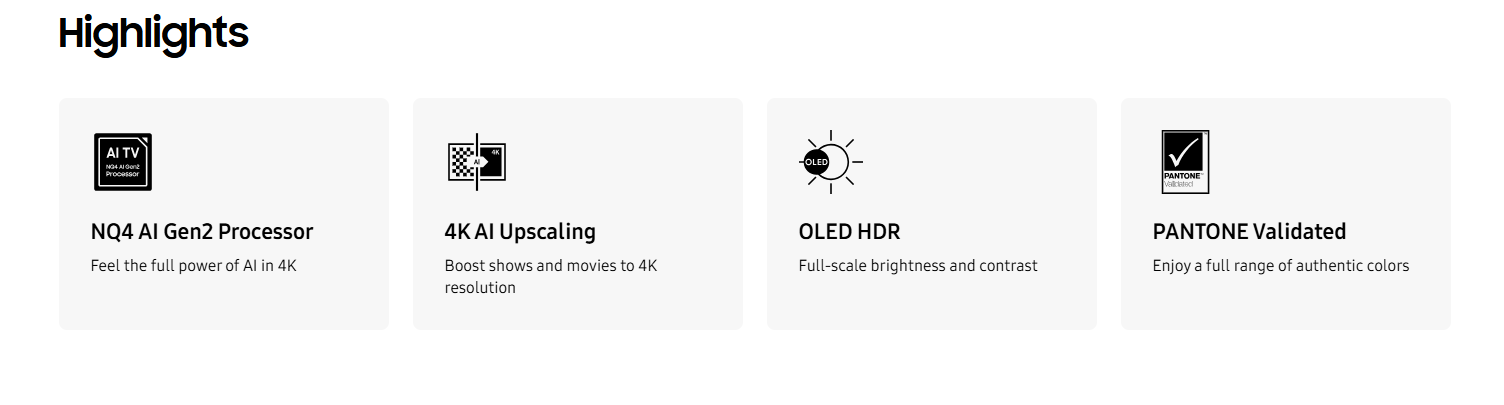 Key features are shown as Samsung NQ4 AI Gen2 Processor, 4K AI Upscaling, OLED HDR and PANTONE Validated.The words Samsung Vision AI with the Samsung AI logo.