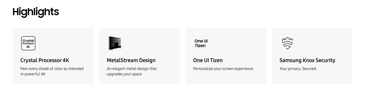 The key features are Crystal Processor 4K, MetalStream Design, Samsung Knox Security and One UI Tizen. The Samsung Crystal UHD Processor 4K chip is set on a TV main board. The back of a MetalStream Design TV is shown with a ridged pattern. The Samsung Knox logo is on a TV screen, with a Secured by Knox logo to the corner. The Samsung TV Plus home screen is shown as a part of One UI Tizen with the option to stream free TV.